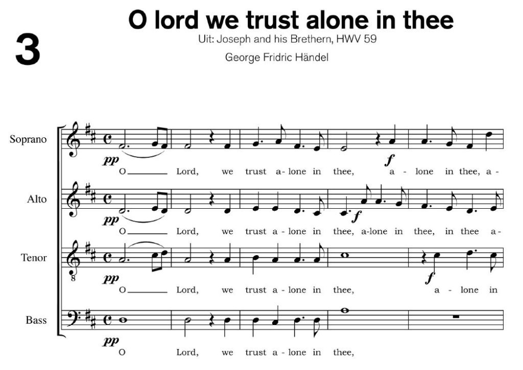 De muziek start als volgt (voor de bladmuziek: zoek binnen Google op “o lord we trust alone in thee”, en kijk dan bij www.dno.nl):