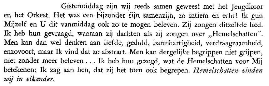 We waren op een zaterdag voorafgaand aan een landelijke jeugdbijeenkomst aan het oefenen met jeugd-koor en -orkest. Lekker samen muziek maken, met een groep leeftijdsgenoten. We speelden en zongen op zeker moment een lied waarin naar voren kwam de frase “steeds nieuwe hemelschatten verspreiden licht en glans“. De landelijk geestelijk verzorger die daar bij was, stelde ons de vraag waar we aan dachten bij ‘hemelschatten’. Toen viel het even stil.