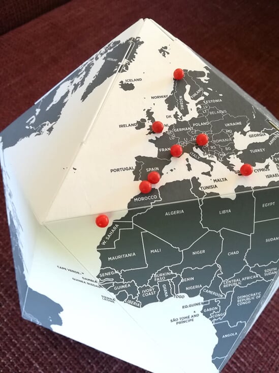 Het platonisch lichaam van de foto liep ik tegen het lijf (!) als een zelf-vouw-plaat, bij de winkel Casa (in La Ciotat, Frankrijk). Het pakket bevat ook een aantal rode speldjes, waarmee je aan kunt geven waar je op de wereld geweest bent. Heel ontluisterend om te zien dat mijn reizen zich slechts op 1 van de 20 mogelijke ‘driehoeken’ hebben afgespeeld. Triest dat ik maar zo’n kleine horizon heb 😉