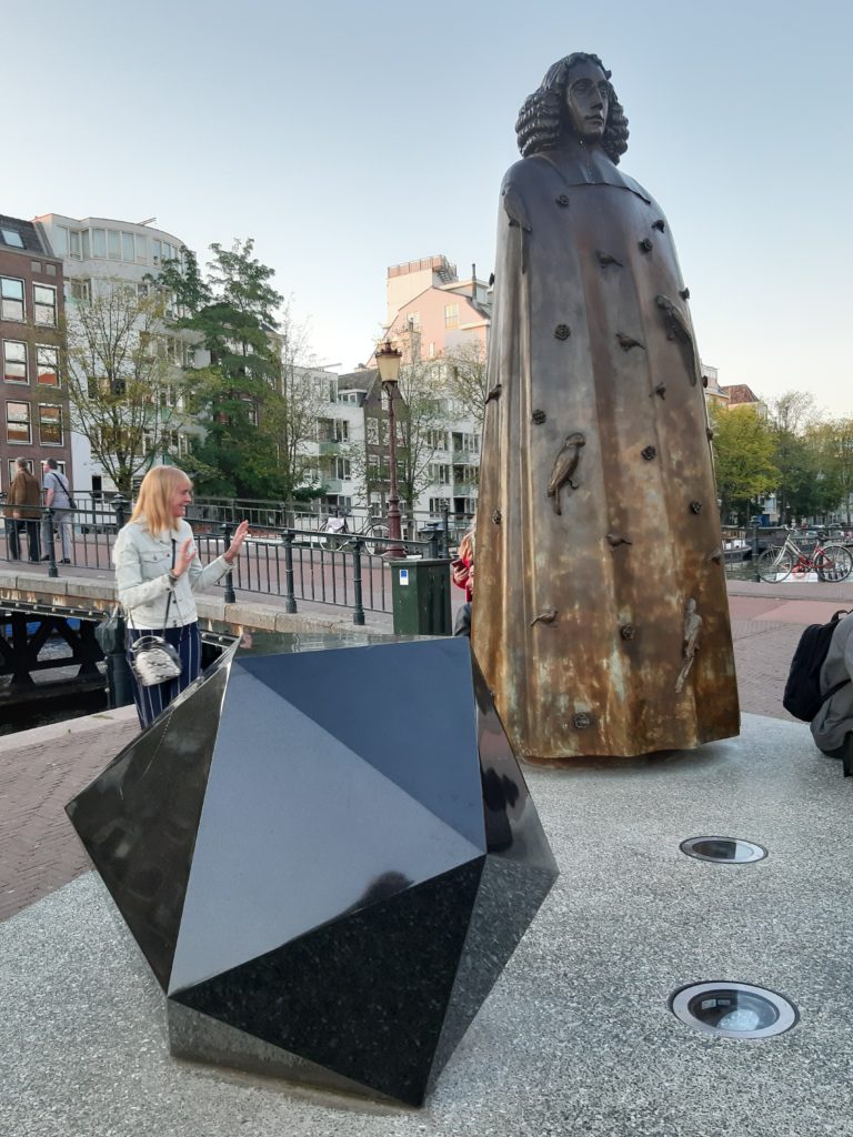 Je herinnert je nog wel de amuse Platonisch lichaam, waarin je kennismaakte met een speciale variant van de wereldbol; dat was eentje die ook nog eens bedoeld was om de plekken op aarde te markeren waar je geweest bent. Als je deze bijzondere vorm eenmaal kent, kom je hem vaker tegen. Voor mij was het toch wel onverwacht dat we op weg waren naar de Stopera (voor meer Stopera; zie de amuse Ervaring) om naar de opera Cavalleria Rusticana te gaan (zie de betreffende amuse voor meer Cavalleria Rusticana). Voor het pand van de Stopera stuitten we op een standbeeld van Spinoza – met een platonisch lichaam;