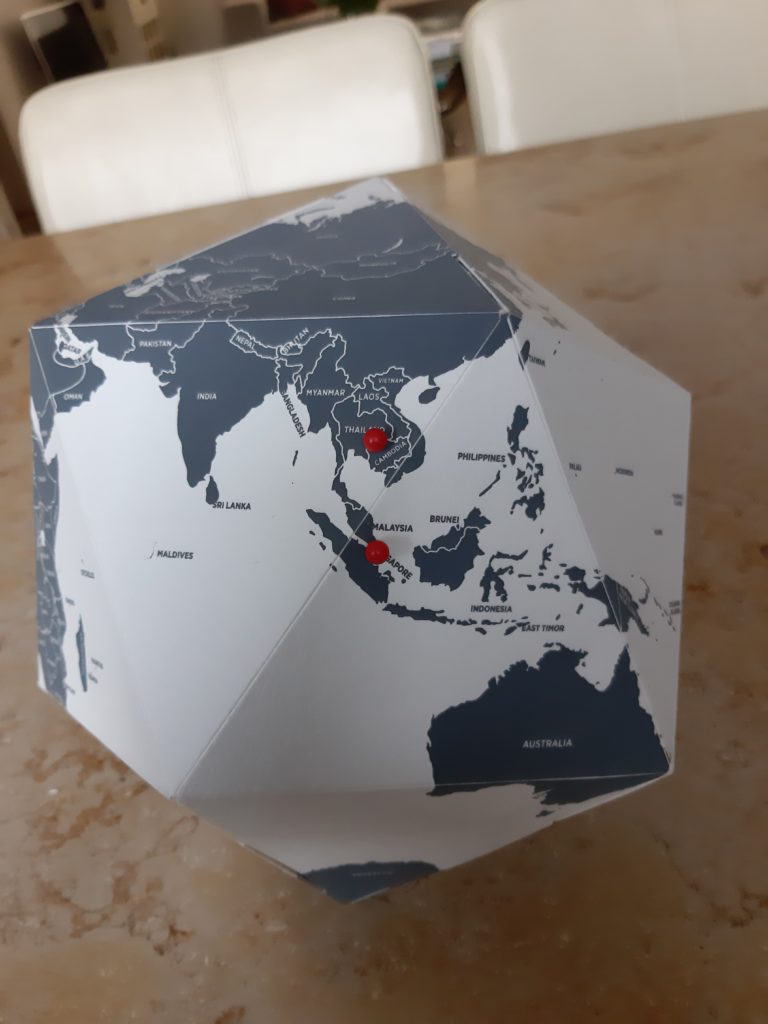 We zijn inmiddels op nog twee andere ‘driehoeken’ van de aarde geweest sinds het verschijnen van de amuse ‘platonisch lichaam’; Singapore en Cambodja hebben we mogen bezoeken, goed voor 2 driehoeken.